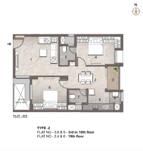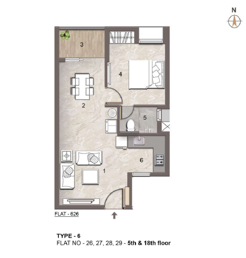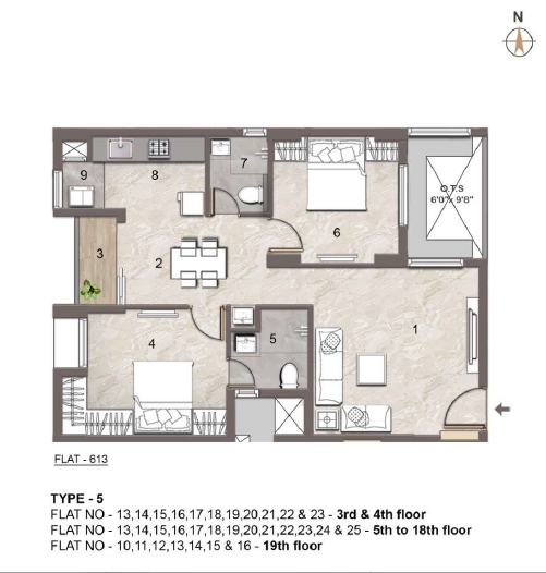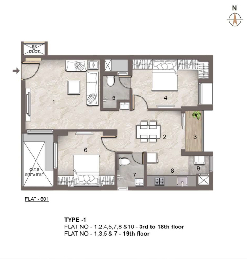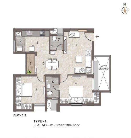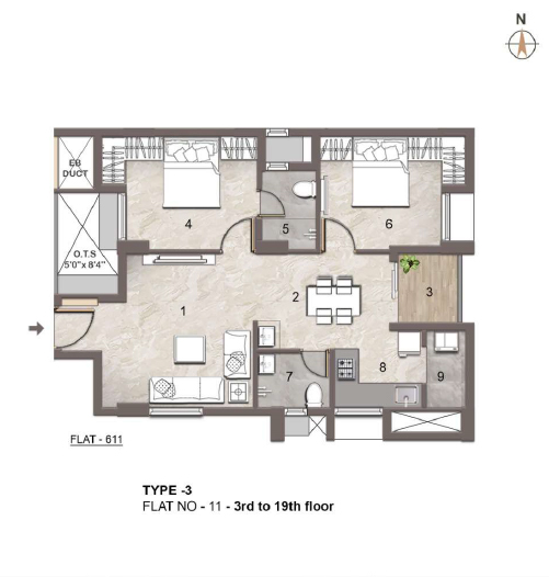 Living, Dining, Bedrooms, and Kitchen will be provided with 4’0″ x 2’0″ vitrified tiles.